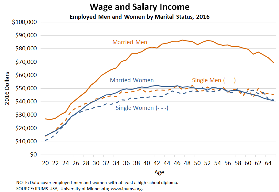 Natomiast po ślubie sytuacja się zmienia. Statystyczny mąż zaczyna harować na utrzymanie całej rodziny, natomiast statystyczna żona wybiera mniej wymagającą i mniej płatną pracę, by mieć czas na opiekę nad dziećmi.